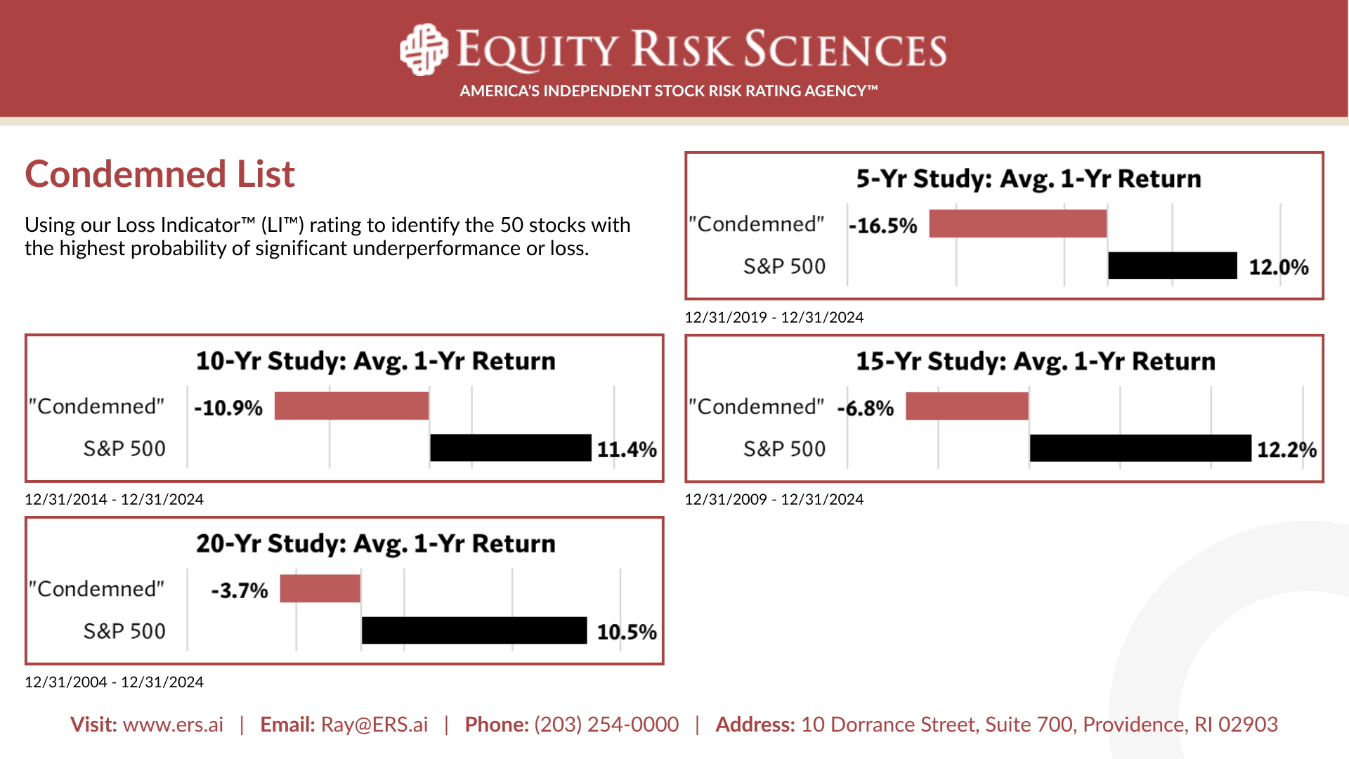 The Condemned List serves two purposes: helping advisors screen existing portfolios for high-risk holdings, and potentially identifying short candidates for sophisticated investors with appropriate risk management capabilities. Stocks may remain on the list for extended periods before declines materialize. Updated regularly as risk profiles evolve.