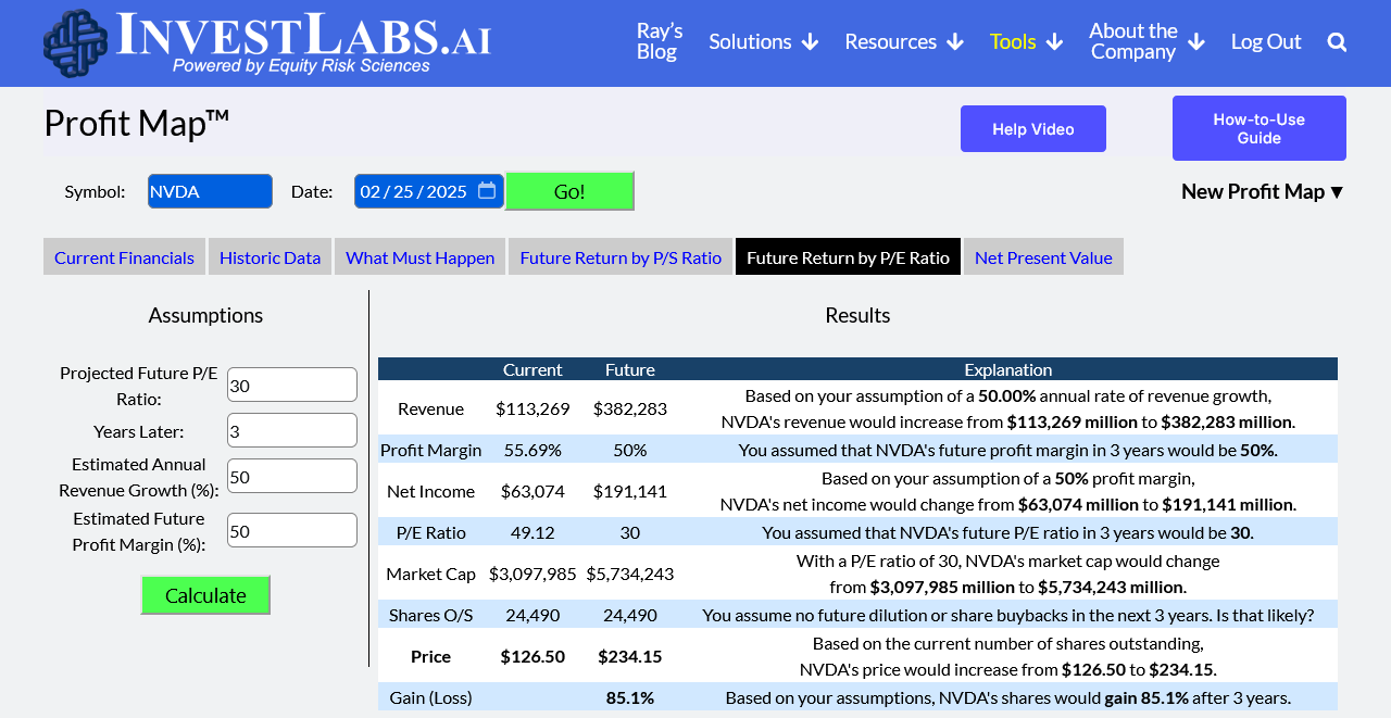 - Projected Future P/E Ratio: 30 (what investors will pay for each dollar of earnings in 3 years).