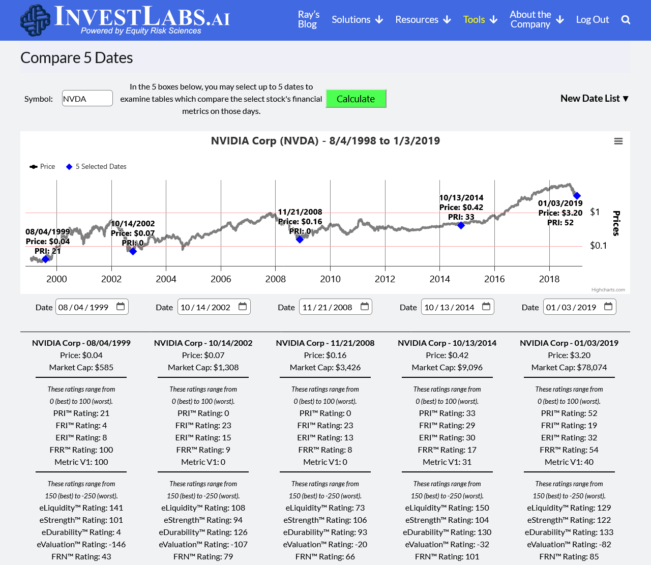 This chart provides a historical analysis of NVIDIA’s stock performance over a 20-year period from 1999 to 2019. It highlights five key dates, showing NVIDIA’s stock price on those days and the proprietary ERS risk ratings assigned at each point in time.