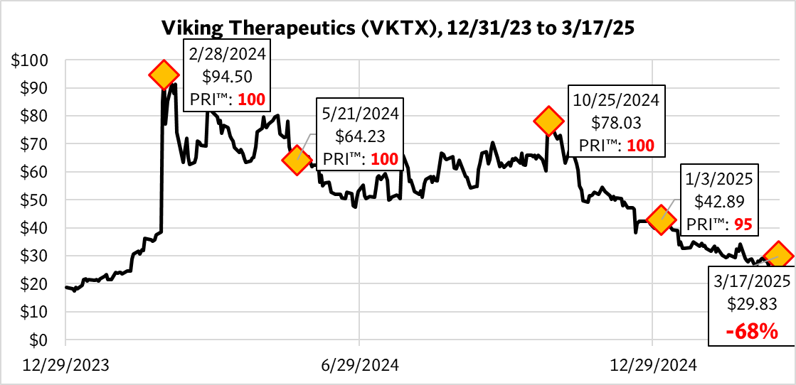 As shown in the above table, VKTX’s PRI™ rating was 100, the worst possible score, on multiple occasions. Even after the stock declined significantly, the risk ratings remained alarmingly high.